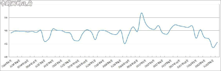 2018年8月,365bet(中国)官方网站 制造业采购经理指数(PMI)为45.7,较上月提高0.2个百分点(见图1)。受生产指数和新订单指数回落的影响,PMI指数继续走弱,5项权重扩散指数除原材料库存指数外,其余指数均处于荣枯线下,受季节性因素影响,我市制造业生产活动出现持续性低迷现象,整体保持稳中放缓的态势。