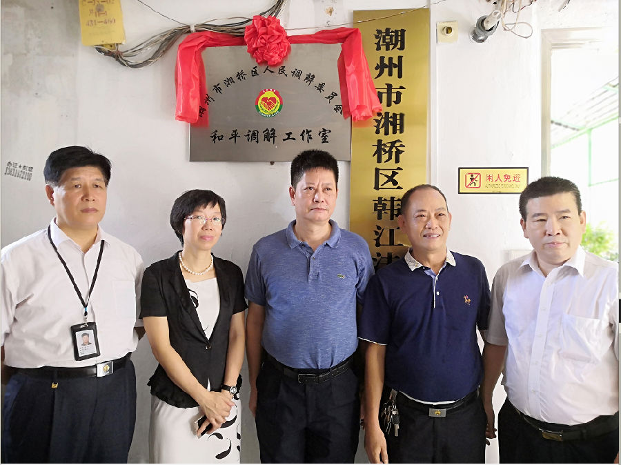 8月6日上午,我市首个个人调解工作室(和平调解工作室)和首个行业性专业性个人调解工作室(阳光调解工作室)在湘桥区揭牌成立。湘桥区人民政府副区长陈庶、市司法局党组成员、副局长林小鹏、湘桥区卫健局党组书记、局长庄建邦,湘桥区司法局党组书记、局长张南高等出席揭牌仪式。湘桥区司法局党组成员、副局长蔡小滢主持揭牌仪式。