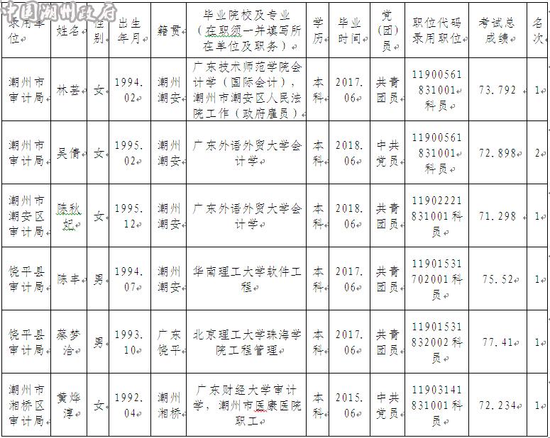根据中共广东省委组织部、省人力资源和社会保障厅、省公务员局《广东省2018年考试录用公务员公告》的有关要求,经笔试、面试、体检、考察合格,现将拟录用公务员予以公示: