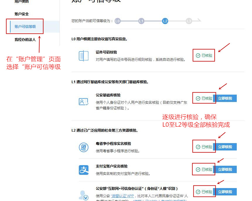 因广东政务服务网个人身份统一认证规则,注册用户需通过账户可信等级认证(L0-L2级认证)后才可进行住房公积金查询。已注册未进行等级认证的指引最后面看认证步骤。