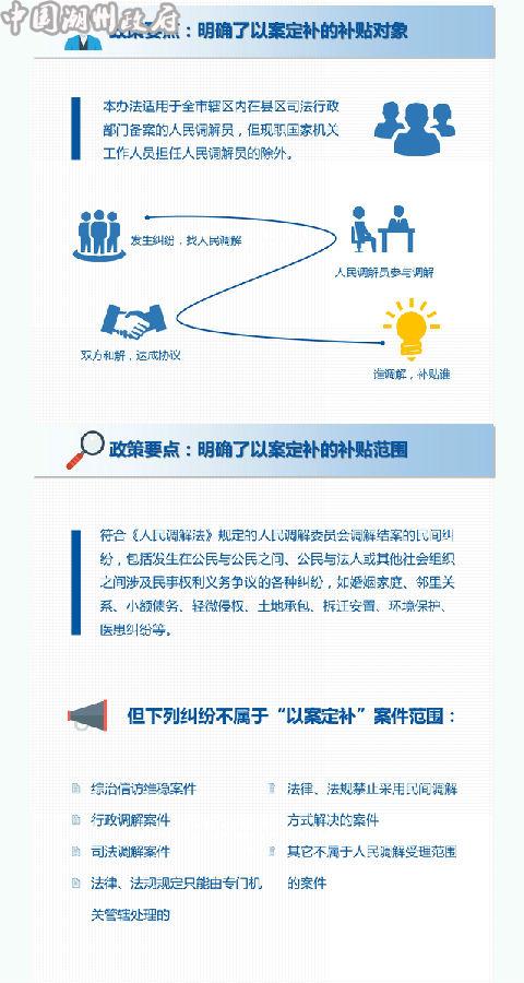 一是明确了以案定补的概念。因目前调解案件涉及的情况较为复杂,为了减少对案件补贴的争议,《办法》中明确补贴的案件概念:“以案定补“是指县区财政对人民调解员成功调解民间纠纷,或虽未成功调解纠纷但已为化解矛盾纠纷付出的办案费用给予适当的补贴和激励。“以案定补”的补贴费用不作为人民调解员的固定报酬。