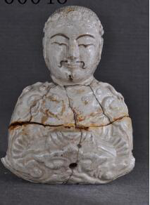 佛像模制成形,前额印宝相花带,手施佛印。眉、眼、胡须绘褐彩,余施青白釉,釉色白中泛灰,釉面有大小开片。胎质灰白色。