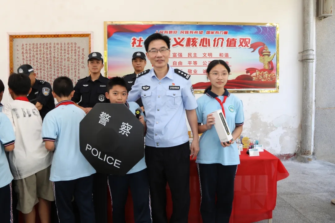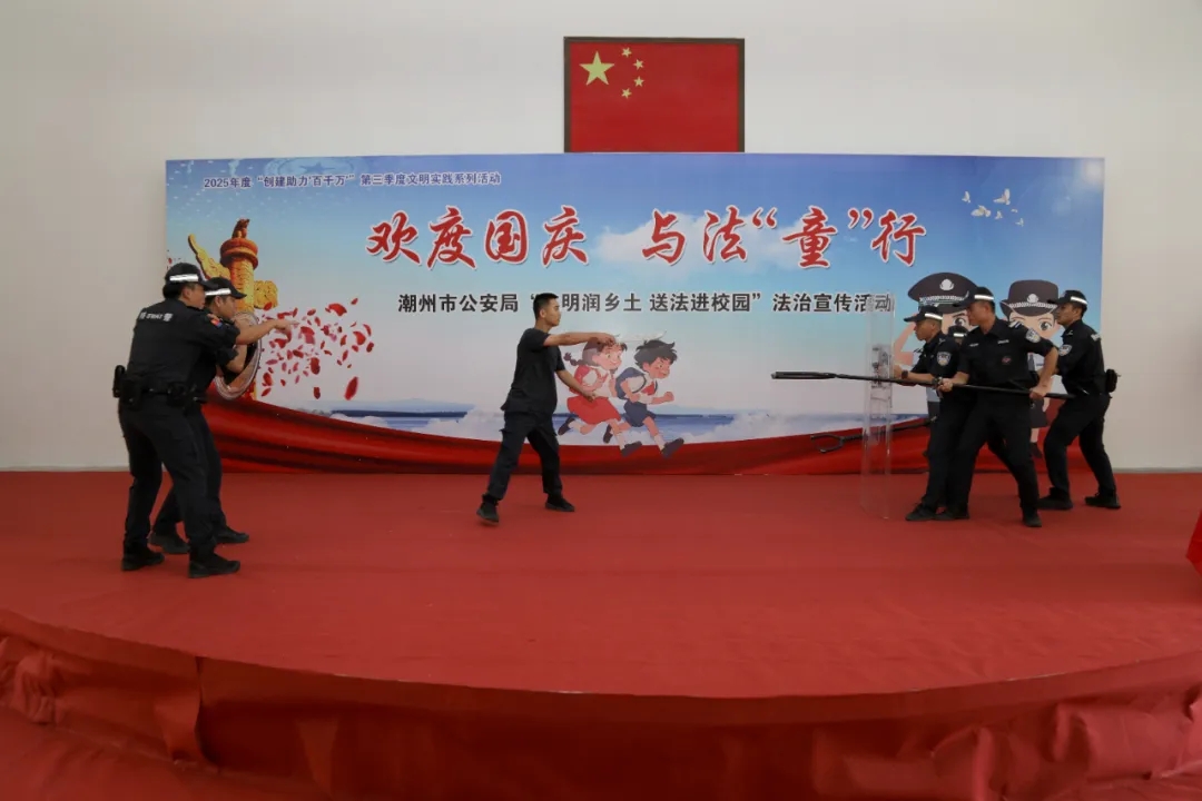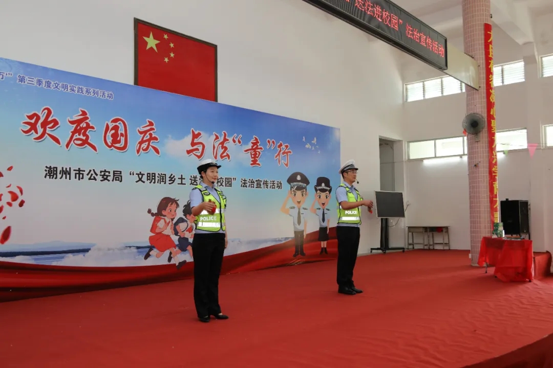 为热烈庆祝中华人民共和国成立76周年,大力营造团结奋进、昂扬向上、喜庆祥和的社会氛围,进一步加强校园安全教育,提高未成年人安全防范意识和自我防护能力,9月26日,市公安局以开展“阳光下的守护”法治公安主题宣传“助力百千万”文明实践为契机,组织刑侦、交管、巡特警、禁毒等警种深入饶平县大埕镇贡天学校举办送法进校园活动。