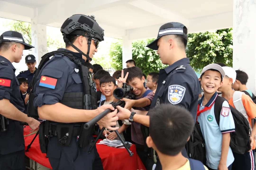 最引人注目的活动环节是巡特警队员带来的防暴处置演练。训练有素的巡特警队员展示了精湛的战术配合和应急处置能力,引来了师生们的阵阵掌声。演练结束后,巡特警队员还向孩子们介绍了各种警用装备的用途,并讲解了遇到危险时的正确应对方法。孩子们第一次近距离接触特警装备,既兴奋又好奇,纷纷表示:“特警叔叔太帅了!我长大了也要当警察!”