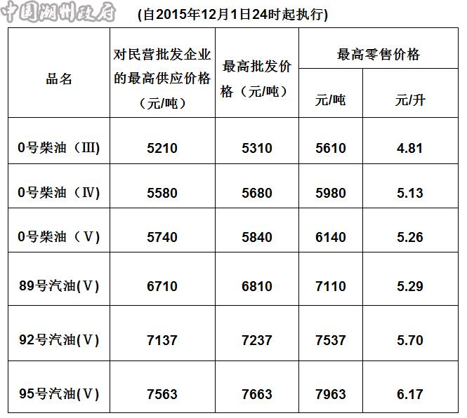 根据国家成品油价格形成机制,结合近一段时期国际市场油价变化情况,国家发展改革委决定自2015年12月1日24时起降低国内成品油价格,即在现行价格的基础上,汽、柴油价格每吨分别降低145元和140元。我省根据国家规定,公布了调整后的广东省汽、柴油最高销售价格。这次成品油价格调整后,国V标准92号汽油从5.81元/升降低到5.70元/升,每升降低0.11元;国V标准95号汽油从6.30元/升降低到6.17元/升,每升降低0.13元;国V标准0号柴油从5.38元/升降低到5.26元/升,每升降低0.12元。