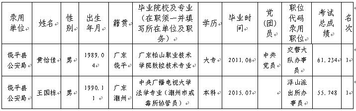 根据中共广东省委组织部、广东省人力资源和社会保障厅、广东省公务员局《广东省2017年考试录用公务员公告》的有关要求,黄怡佳、王国栋等同志经笔试、体能测试、面试、体检、政审考察合格,并报省公安厅审核通过,拟录用为365bet(中国)官方网站 公安机关公务员,现予以公示。