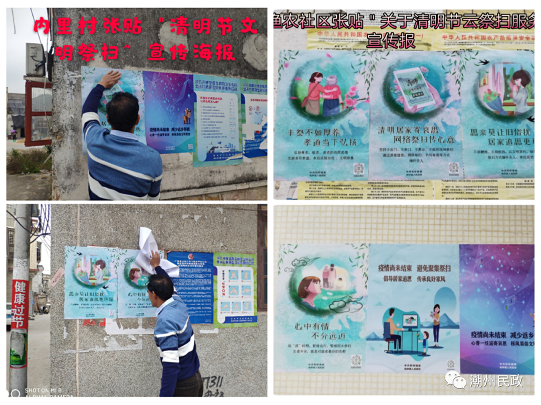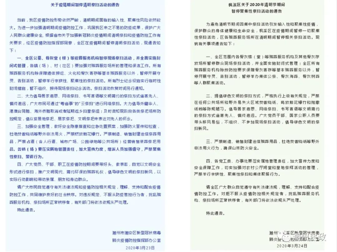 ▲根据省、市有关疫情防控工作要求,在疫情防控期间,湘桥区禁止一切聚集性祭扫活动,清明期间全区公益性墓地、骨灰楼(堂)实施封闭式管理,暂停祭扫服务。 ▲湘桥区铁铺镇桂林村要求村民不要到人群聚集场所扎堆祭扫,劝导外地村民取消返乡祭祖,倡导村民主动践行文明简约、绿色低碳的祭扫新风尚,倡导居家追思、网络祭扫、鲜花祭扫,传扬慎终追远、孝亲感恩的清明文化内核。同时,桂林村新时代文明实践站组织志愿者利用村大喇叭对清明节期间防疫防控要求进行宣传广播,倡导文明过节新风尚,通过接地气的方式让村民听得懂、听得进。 ▲柘林镇在各主要路口和各村(社区)悬挂清明节文明祭扫宣传横幅,各村(社区)利用有线广播每天播放饶平县关于2020年清明防疫广播稿,倡导移风易俗,转变传统祭扫习俗,树立文明殡葬新风。 ▲柘林镇印发《致全镇人民的一封公开信》和县防控办《关于疫情期间暂停清明祭扫活动的通告》9000多份,张贴中共广东省委宣传部、广东省民政厅联合印发的大型宣传海报11套共66张,确保各镇党委、政府和宣传部门的决策部署家喻户晓,深入人心,营造浓烈的宣传氛围。 ▲潮安区和枫溪区发布关于疫情期间暂停清明祭扫活动的通告,并通过宣传车进行宣传。