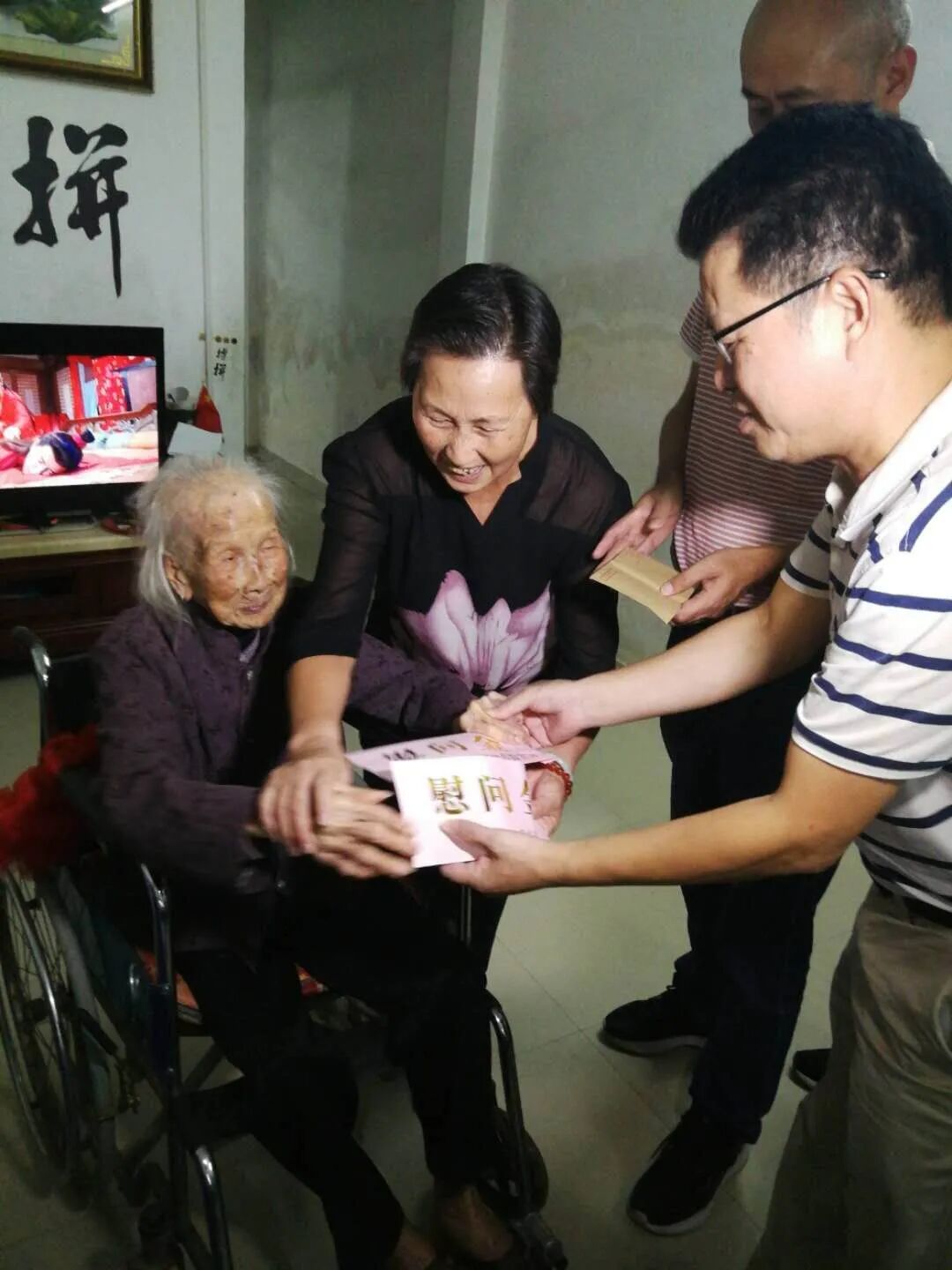 ▲湘桥区民政局、慈善总会将慰问金送到百岁老人家中,并送上党和政府亲切的关怀,同时叮嘱老人的家人要悉心照顾好老人的日常起居生活,让老人的晚年生活更加幸福。