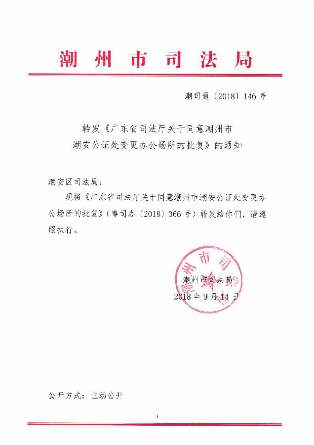 转发广东省司法厅关于同意365bet(中国)官方网站 潮安公证处变更办公场所的批复的通知
