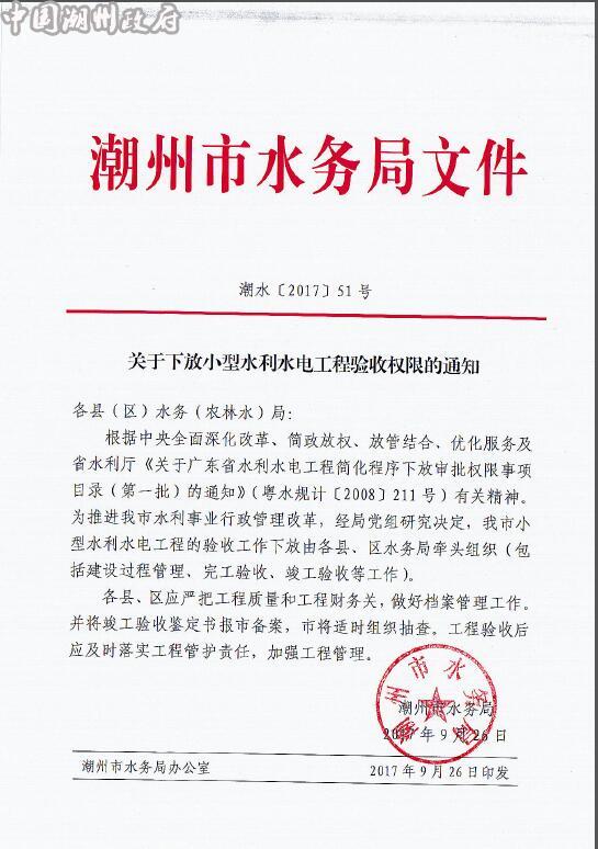 市水务局:关于下放小型水利水电工程验收权限的通知