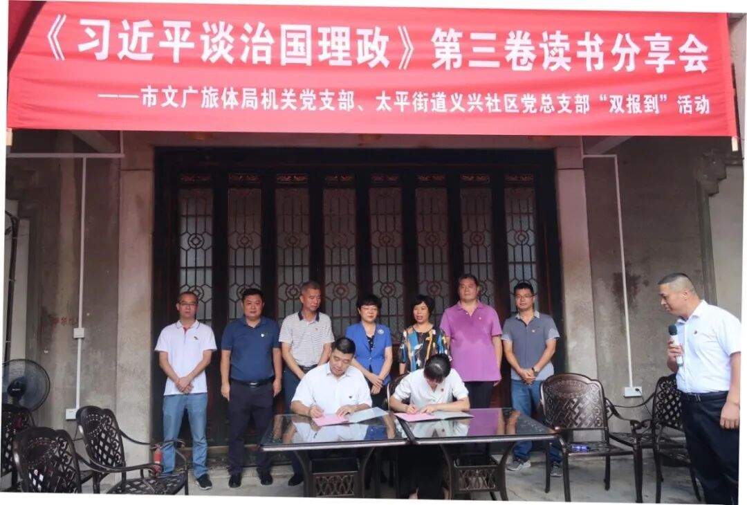 8月14日,市文广旅体局机关党支部与太平街道义兴社区在古城区茶舍举办“双报到”活动暨《习近平谈治国理政》第三卷读书分享会。市政府副市长余鸿纯同志以普通党员身份参与活动。