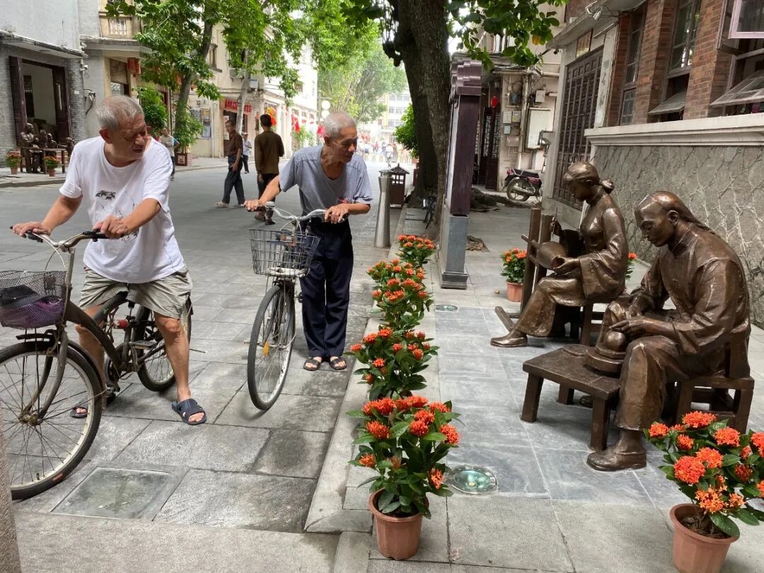 当天上午,卓桂芬带着女儿——潮绣市级非遗传承人李晓丹一边仔细地欣赏雕塑,一边不停地合影留念。“非遗传承需要见人见物见生活。这些雕塑把非遗和生活结合起来,拉进了非遗文化与普通人之间的距离,这个推广方式很不错!”李晓丹说。