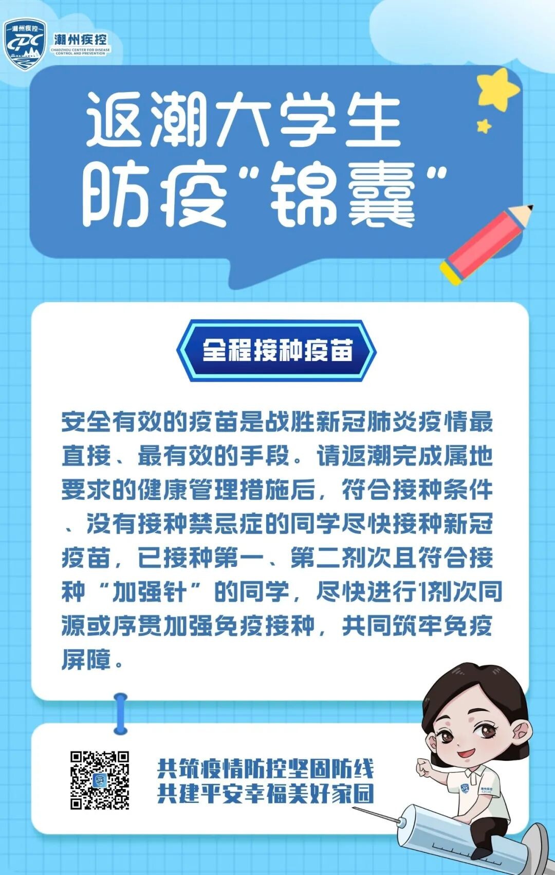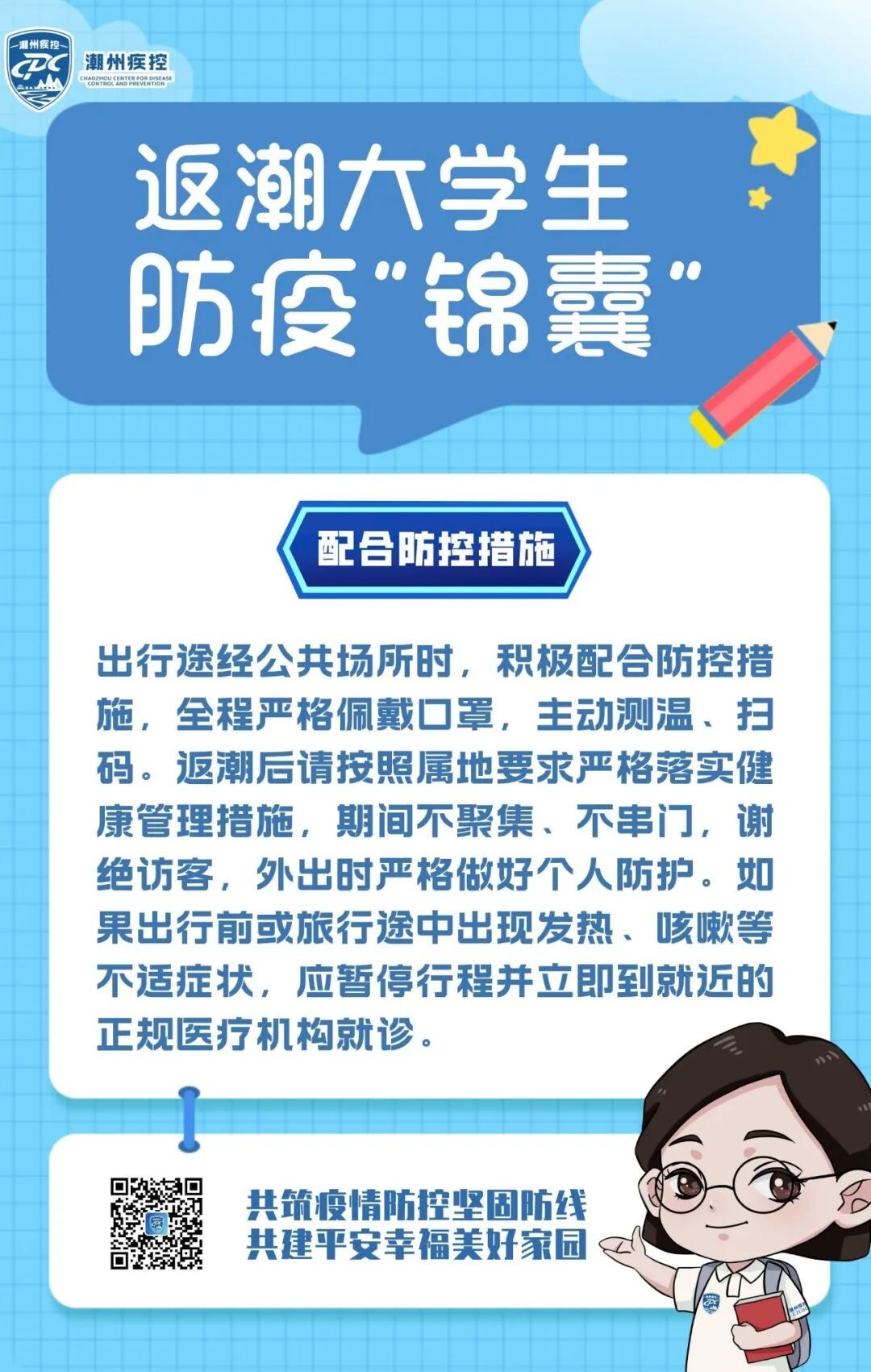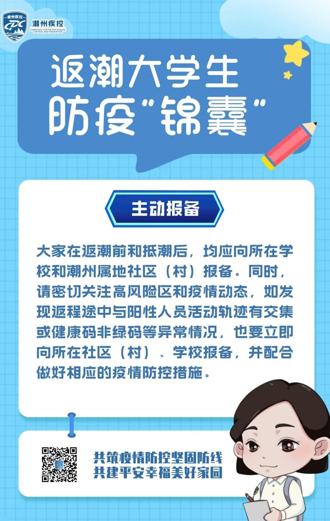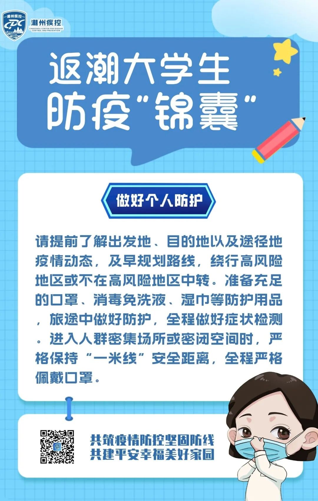 当前,国内疫情呈现多点散发、多地频发、局部暴发态势,“外防输入、内防反弹”的压力依然很大。为了让外地学子们能够顺利、安全、健康返潮,持续巩固家乡来之不易的疫情防控成果,请您收好这份返潮防疫“锦囊”。