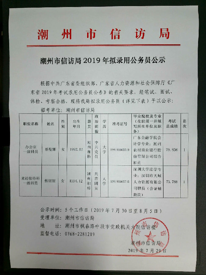 365bet(中国)官方网站 信访局2019年拟录用公务员公示