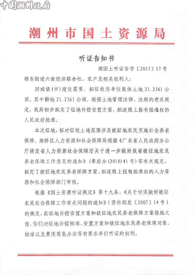 听证告知书(潮国土听证告字【2015】17号)