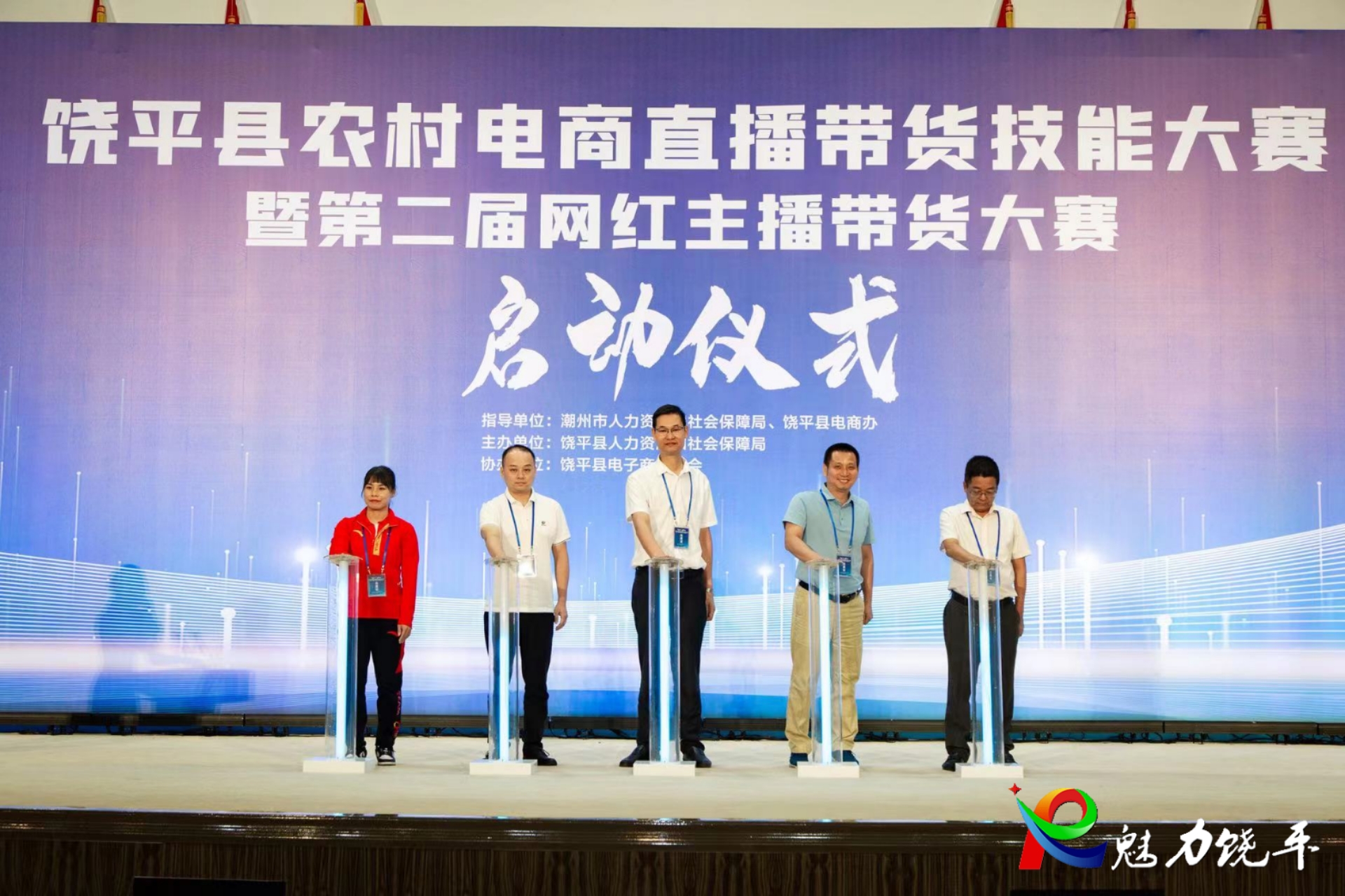 县委常委、统战部部长、县电商办主任黄子鸿,省人社厅人事考试局副局长何志强,市人社局副局长吴伟鹏,县人社局局长文培洪,世界冠军张宛琼等参加启动仪式,并为饶平县农村电商直播带货技能大赛暨第二届网红主播带货大赛按下启动键。